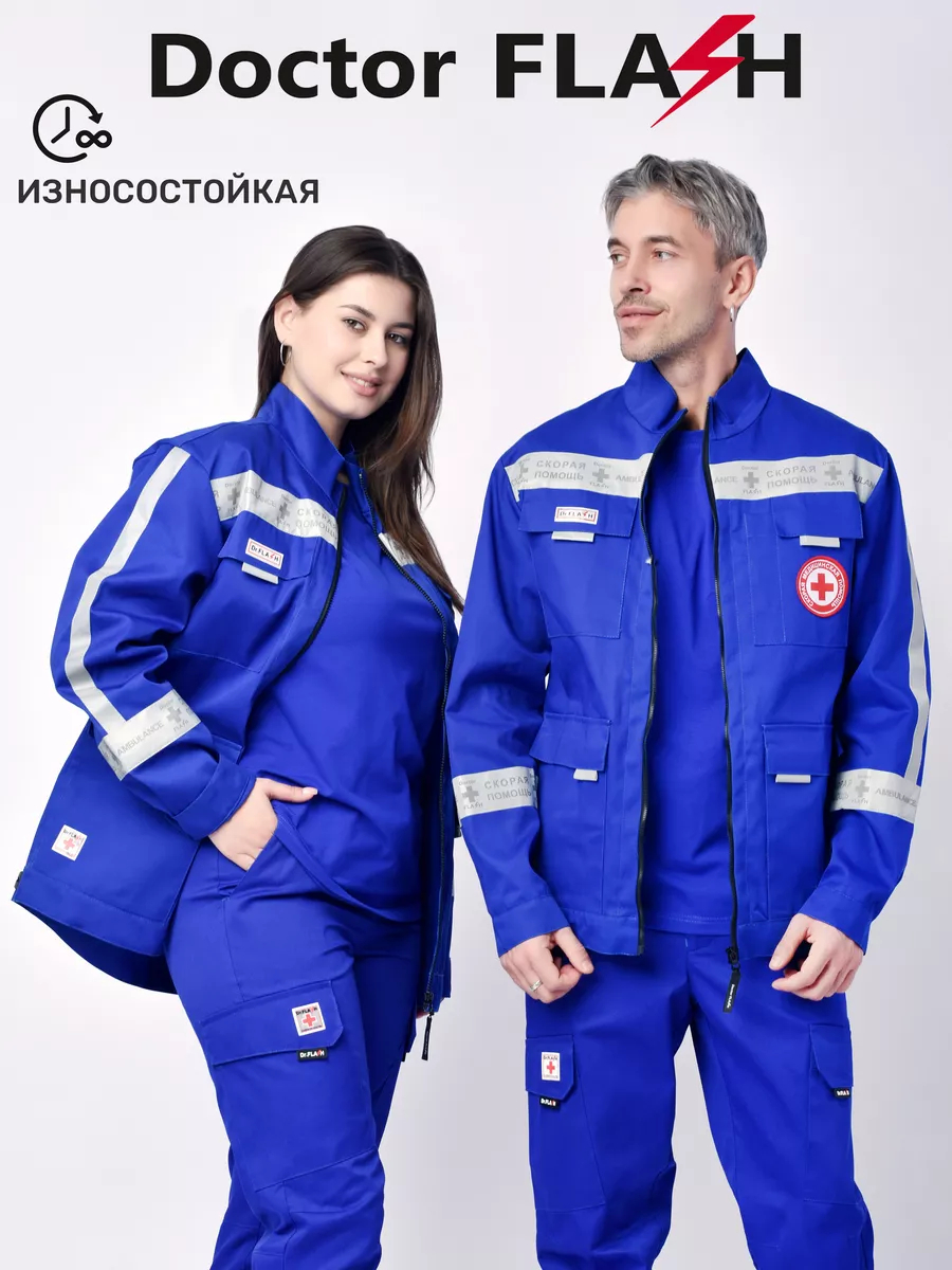 Куртка унисекс «Флеш» для скорой помощи - лёгкая, износостойкая и заметная в любых условиях рабочая куртка для врачей, фельдшеров и водителей. Прямой силуэт с центральной застёжкой молнией и притачным поясом удобно садится на любую фигуру, а воротник стойка защищает шею от ветра и придаёт форме аккуратный, собранный вид. Куртка выполнена из смесовой ткани (65% полиэстер, 35% хлопок): полиэстер отвечает за прочность, износостойкость и минимальную усадку, хлопок помогает коже дышать и отводит влагу, а водоотталкивающая пропитка и формоустойчивость делают изделие удобным для ежедневной носки и частых стирок. По груди и спинке проходят светоотражающие полосы шириной 50 мм с коэффициентом световозвращения 500 кд/(лк·м²), поэтому сотрудник хорошо заметен в фарах автомобиля и уличном освещении, что особенно важно на выездах в тёмное время суток. На спинке - крупная термопечать «Скорая помощь» белого цвета, на левом нагрудном кармане - круглый шеврон «Скорая медицинская помощь», подчёркивающие принадлежность к службе. Куртка оснащена шестью функциональными карманами: двумя нагрудными на липучке и четырьмя нижними накладными - для перчаток, фонарика, блокнота, рации и других рабочих мелочей. По бокам пояса расположены регулировочные паты липучки, которые позволяют подогнать объём по фигуре и комфортно носить куртку. Сделайте ваш рабочий день легче и ярче - доверьтесь качеству и современному дизайну от Doctor FLASH (Доктор ФЛЕШ)!